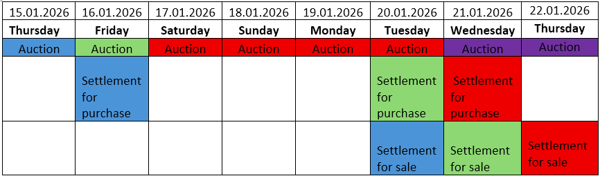 According to the Holiday Calendar – 2026, 19.01 (Monday) is non-working day for activities related to clearing. The clearing of the organized market – day-ahead segment will be carried out in accordance with the following activity calendar: