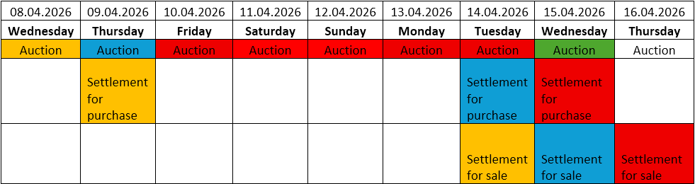 According to the Holiday Calendar – 2026, 10.04 (Friday) and 13.04 (Monday) are non-working days for clearing-related activities. Clearing on the organised market – the Day-Ahead segment – will take place according to the following activity calendar: